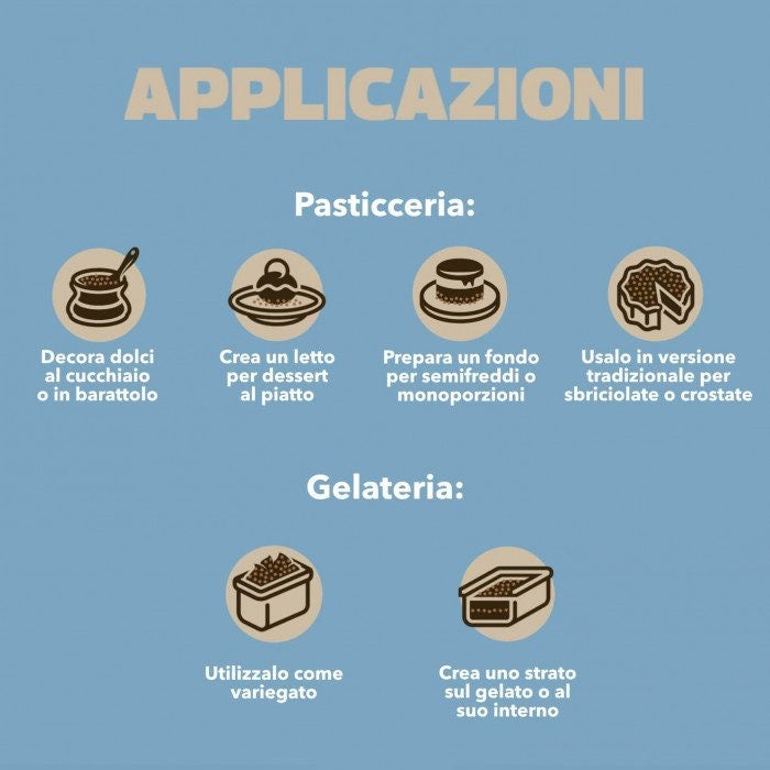 Pastry: Decorate spoon or jar desserts, create a bed for plated desserts, prepare a base for semifreddos or single portions or use it in the traditional version for crumbles or tarts.